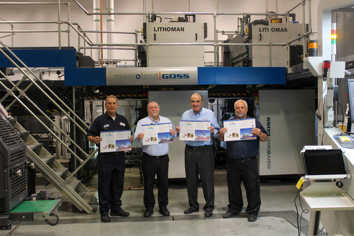 From the left, Shawn DeLorey, lead four-color web press operator; Rick Dunn, executive vice president; John Galligan, president; and Mike Daugherty, pressroom manager; oversaw and implemented the breakthrough LED-UV technology usage on a high-speed web offset press.